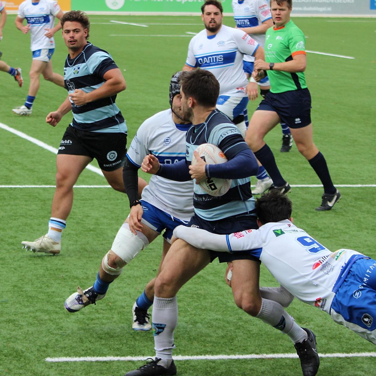 De voorwaartsen namen het initiatief. Nadat nummer 10, Manus Bailey, de Oysters via een penaltykick op voorsprong had gezet, was het de uitblinkende prop Will Stanley die na een perfect uitgevoerde line-out de eerste try drukte. Even later herhaalde tweede-rijer Mitchell Thijs het kunstje met een krachtige drive over de lijn. De front eight heerste, het rugbyadagium “de voorwaartsen bepalen of je wint, de backs met hoeveel” werd vandaag opnieuw bewezen. Amsterdam gaf zich echter niet gewonnen en noteerde vlak voor rust een eigen try: 7–17 bij het fluitsignaal, een mooie marge — maar met windkracht zes tegen in de tweede helft, verre van comfortabel.