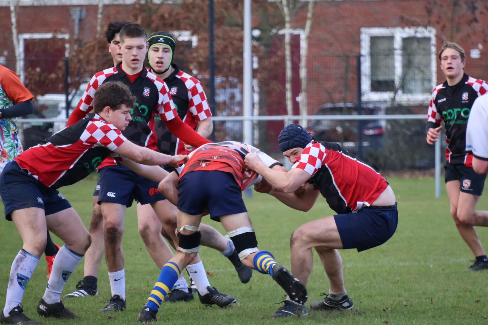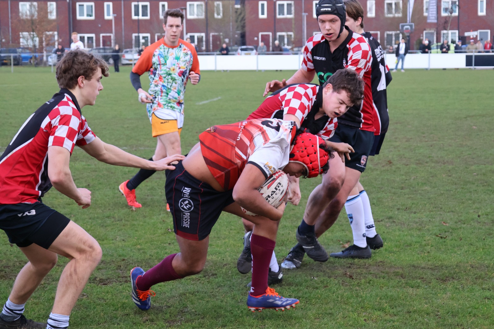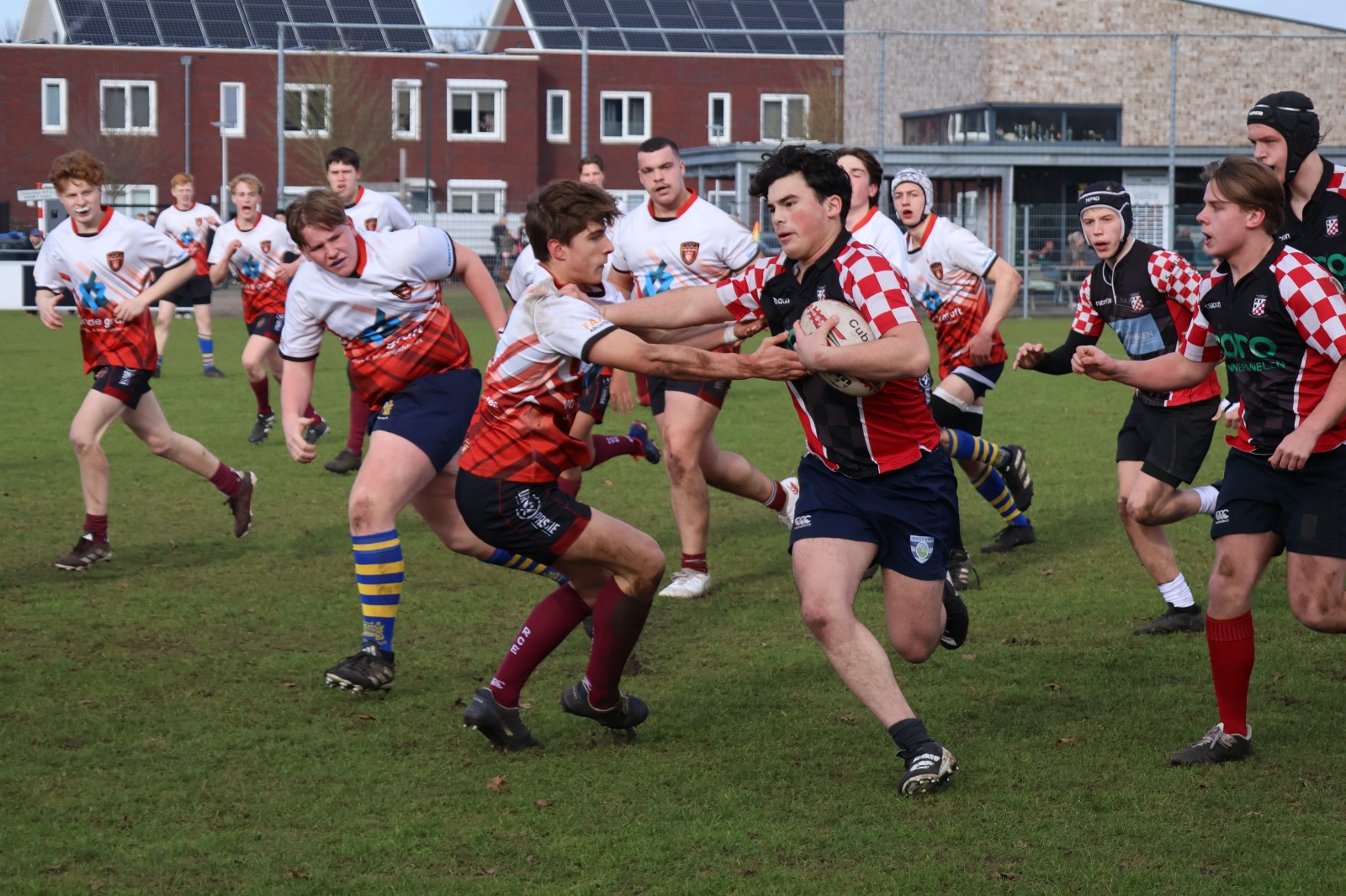 Ondanks de iets langere warming-up begonnen we de wedstrijd slecht met een vroege try tegen en vervolgens nog een interceptie, waar ook een try uit kwam. Na deze tries werden we wakker en begonnen we op te letten, toen waren we zuinig op de bal en werkten we ons naar hun 5-meter lijn, waar we na 2 penalties uiteindelijk wisten te scoren, na deze try kregen we nog een keer een try tegen en de rest van de eerste helft hadden wij het heft in handen.