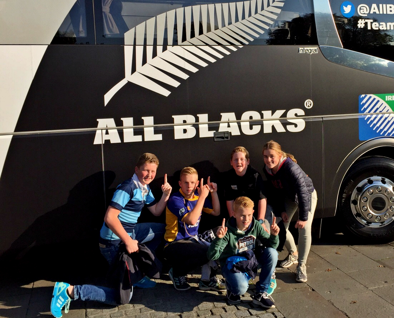 We kwamen aan in het hotel en toen zag je meteen al heel veel Nieuw Zeeland fans. Wij waren eigenlijk voor allebei. Samen met de hele familie Boor, Bjorn en Glen zijn we naar het stadion gegaan. Toen we door de straten liepen zagen we midden in het centrum het Millennium stadion, het kasteel van Cardiff met een grote rugbybal in de muur en bij een hotel de bus van de All Blacks! Het was heel gezellig in de straten en iedereen die je zag kwam om rugby te kijken. In een sportwinkel kon je nieuwe shirts kopen van alle landen en WK rugbyballen. Toen we buiten kwamen zagen we vier paarden aankomen met daarachter de bus van de All Blacks op weg naar het Millennium Stadion. Vet! Er werd volop gezongen.