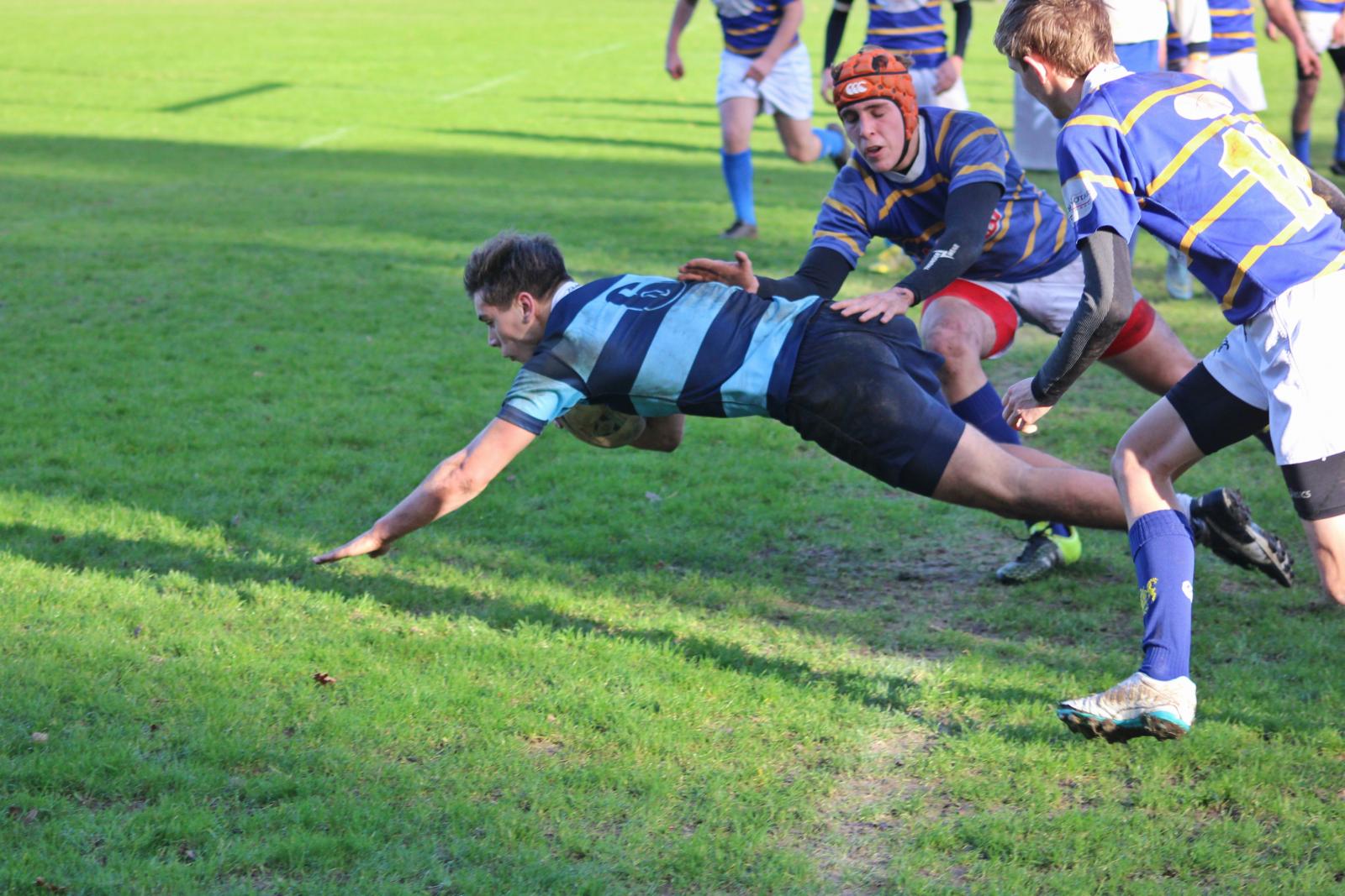 Het begin van de wedstrijd ging vrij gelijk op, hoewel het spel zich voornamelijk op onze helft van het veld afspeelde. Beide teams lieten zowel goed verdedigend als aanvallend werk zien, en vrijwel de hele wedstrijd werd er goed getackeld. In de 19e minuut kwam HRC na een line out vlak bij onze tryline op voorsprong met een geconverteerde try. Vijf minuten later kon de tegenstander met een try vanuit een penalty op de middenlijn hun voorsprong uitbreiden tot 14-0. Inmiddels was scrum-half Jim uitgevallen door een trap op zijn enkel. Net voor de rust kon Luc, na een penalty nabij de tryline van de tegenstander, de score op 5-14 brengen.