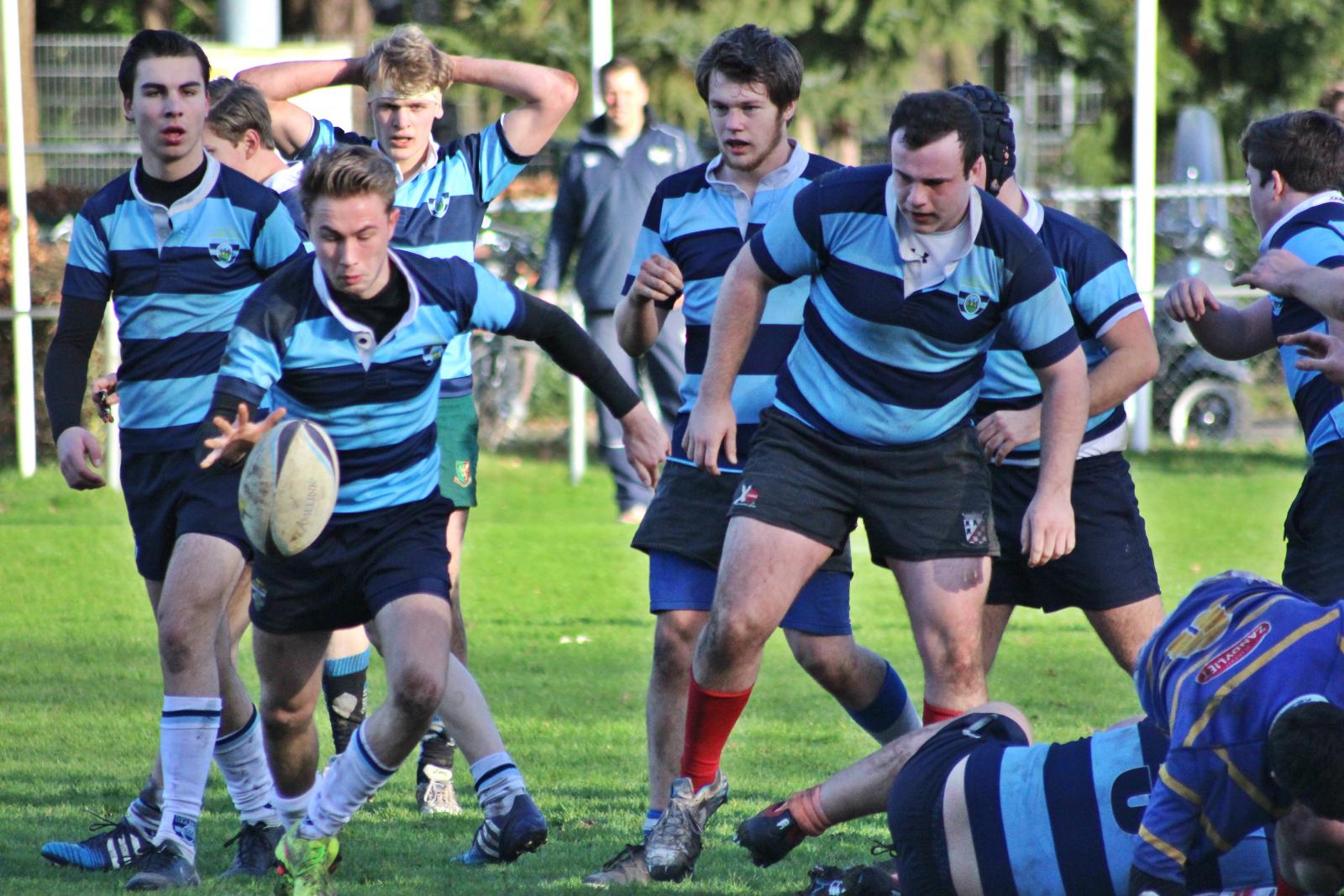 Na de rust kregen wij de overhand op het spel, direct werd massaal de aanval ingezet en al in de tweede minuut kon Daan, na een mooie vangbal van Thomas, de vierde try van de wedstrijd drukken en de achterstand terugbrengen tot 10-14. Drie minuten daarna zette HRC dit echter weer recht via mooi lijnspel waaruit een wederom geconverteerde try werd gescoord en de stand op 10-21 werd gebracht. Helaas viel ook de invallende scrum-half Jesse uit door een tik tegen zijn onderbeen, en moest er in de lijn wat geschoven worden met posities. De thuisspelende clusterploeg liet het hoofd echter niet zakken en alle spelers uit het team deden hun uiterste best om weer op gelijke hoogte te komen met de tegenstander. Foutjes werden snel hersteld door goed verdedigend werk waardoor de bal weer in ons bezit kwam. Ook het scrummen ging heel goed. Dit harde werken werd beloond met een try van Isaäc in de 63e minuut: 15-21. Er was nog één try met conversie nodig voor de overwinning, en het team gaf, mede door het opzwepende gejuich van het publiek, alles om dit te bereiken. De wisselspelers werden ingezet en in de laatste fase van de wedstrijd kregen we op de 22 meter lijn van de tegenstander een penalty mee en roken we de kans op de overwinning. Helaas ging de kick net niet ver genoeg om een line-out te krijgen, en tot overmaat van ramp werd deze bal gevangen door een speler van HRC en benut om via een rush langs de zijlijn en enkele gemiste tackles van ons een tegentry te scoren. Er was toen onvoldoende tijd om dit nog recht te zetten, waardoor de eindstand 15-28 bleef. Desalniettemin verlieten de spelers met opgeheven hoofd het veld, want er was door iedereen prima gerugbyd, en het teamspel wordt gedurende het seizoen steeds beter. Laten we deze lijn volgende week in Goes tegen Tovaal/Bekaro voortzetten en onszelf belonen met een overwinning!