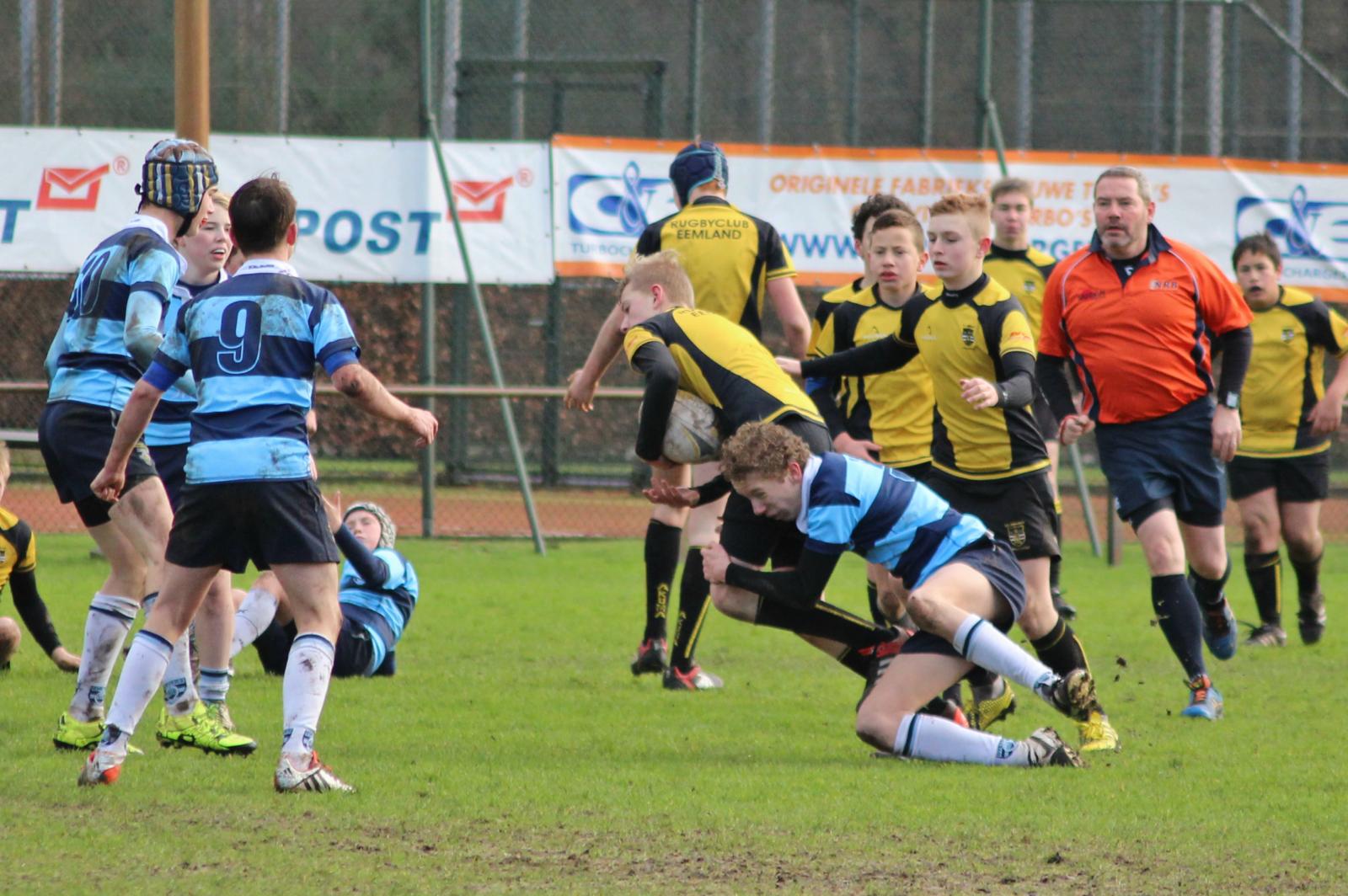 Met het warm lopen kregen we een harde sneeuwbui, dit houd ons niet tegen en we beginnen aan de wedstrijd. De eerste 5 à 10 minuten gaat het redelijk gelijk op, totdat Eemland scoort. Dit doen ze 2 keer snel achter elkaar. Na zo’n 15 minuten speeltijd van de eerste helft hebben wij een penalty. Deze wordt genomen en gegooid naar Martijn die vervolgens bijna een try drukt. Pieter maakt ook nog de kick.