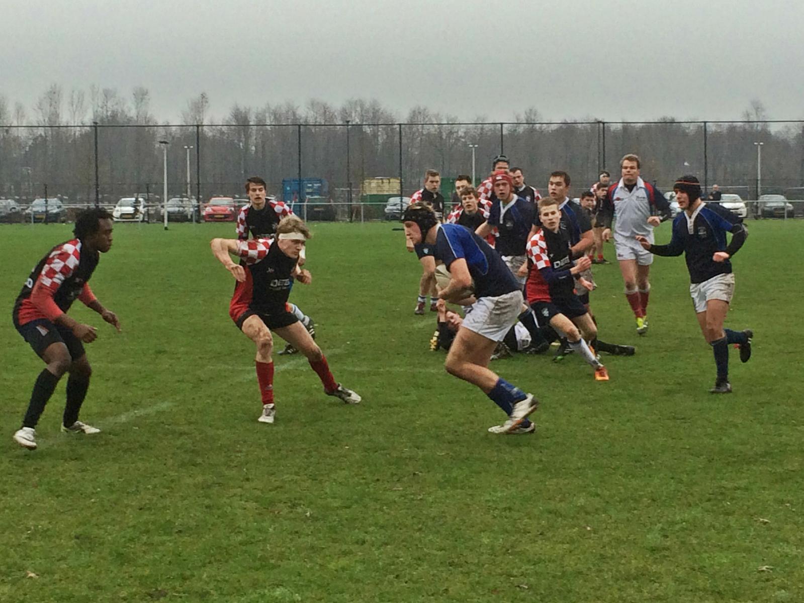 Het sterke ARC kon direct hun stempel op de wedstrijd drukken door na 5 minuten hun eerste try te scoren. Onze jongen lieten dit echter niet op hen zitten en zetten alles in het werk om een tegentry te scoren. De snel oplopende en sterke verdediging van ARC was daar uiteraard op bedacht en voorkwam dit steeds weer. In de negende minuut kregen we echter een penalty en Matteo koos voor de palen. Hij kickte de bal recht door het midden, en de nul was van ons scorebord: 3-5.