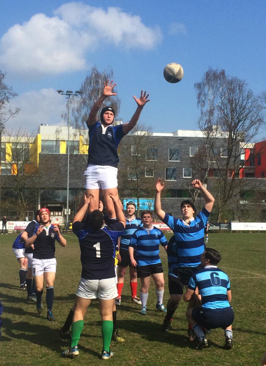 Onze bank werd daarom uitgebreid tot 3 wisselspelers en de overige 13 konden hun borst natmaken voor de wedstrijd tegen de uitgedunde maar nog altijd sterke tegenstander.In het begin was er van beide zijden goed spel te zien en ging het gelijk op. In de negende minuut werd er door ons een aanval ingezet en Isaac gaf daarbij goed support, kreeg de bal en kon de aanval afmaken met een mooie try. Matteo bracht met de conversie de score op 0-7.